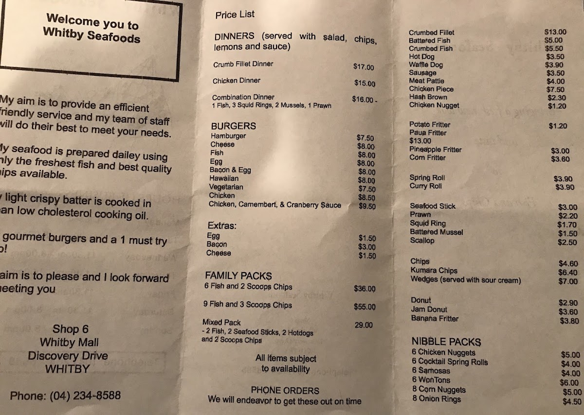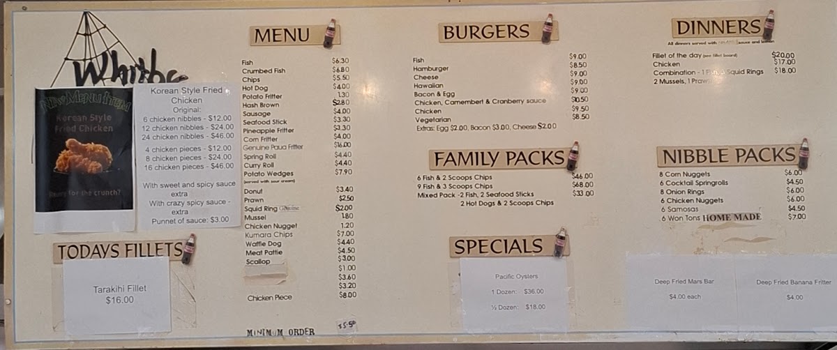 Whitby Seafoods offers a diverse and appealing menu, perfect for all tastes. The Family Packs are a standout, featuring generous portions like 6 Fish & 2 Scoops Chips and a choice of 4 Boneless Chicken Pieces with either Sweet and Spicy Sauce or Crazy Spicy Sauce. For those craving a chicken fix, the menu also includes 24 Chicken Nibbles with the same sauce options, or 12 Chicken Nibbles. If you're in the mood for something lighter, the Featured Items like Meat Patties, Com Fritter, Hot Dog, and Wedges served with sour cream provide great variety. For snack lovers, the Nibble Packs include options like 6 Cocktail Spring Rolls, 6 Chicken Nuggets, and 8 Onion Rings, perfect for sharing. The Burgers section features crowd favorites such as the Egg Burger, Chicken Burger, Cheeseburger, Hawaiian Burger, and Bacon & Egg Burger. Finally, for a hearty meal, the Dinners include satisfying options like Crumb Fillet Dinner, Combination Dinner, and Chicken Dinner, ensuring there’s something for everyone. Overall, Whitby Seafoods' menu combines a range of delicious dishes that cater to families, casual diners, and those in the mood for a quick snack or a filling meal.